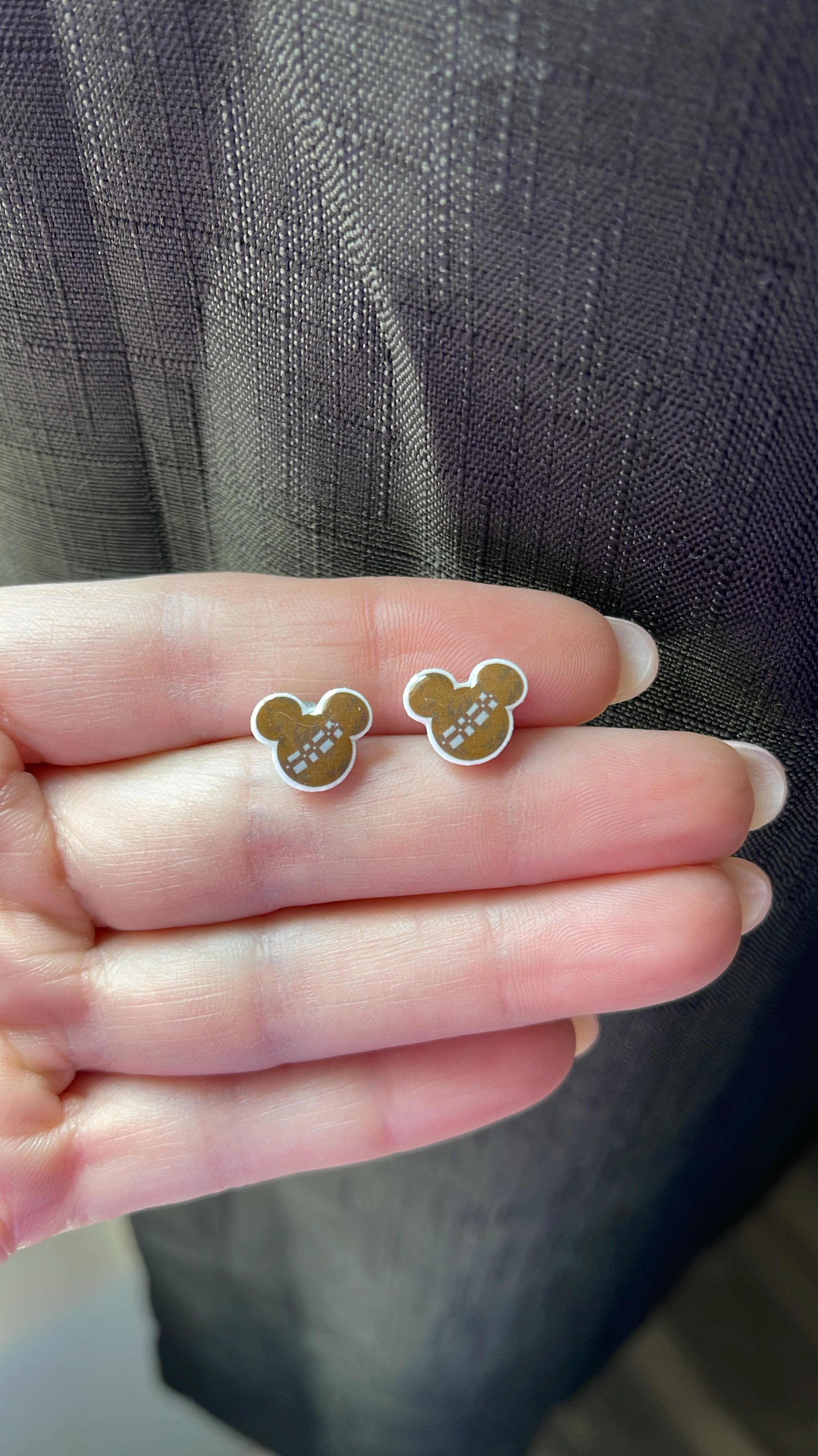 Small acrylic printed earrings in the shape of the iconic Disney ears. Styles include Chewbacca, Darth Vader, or R2D2.